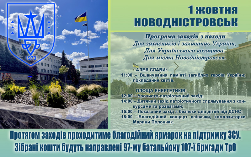 Отож остаточна дата Дня міста Новодністровськ – 1 жовтня, в День Покрови Пресвятої Богородиці. І на цей день заплановані заходи: вшануємо мужність захисників та захисниць, які з часів Гетьманщини і дотепер боронять Україну та віддамо шану пам’яті загиблих героїв України. Дітям запропонуємо участь у конкурсах і розвагах, а працівники ДСНС проведуть дня них показовий захід з безпеки. Ввечері чарівна Марина Полончак даруватиме новодністровцям та гостям міста свій пісенний та композиторський талант, поєднуючи українські народні мотиви з сучасними ритмами. І впродовж всього дня, починаючи з 12 години, на площу Енергетиків буде благодійний ярмарок, всі виручені кошти з якого будуть направлені на підтримку 97-го батальйону 107-ї бригади територіальної оборони, де служить багато наших земляків.