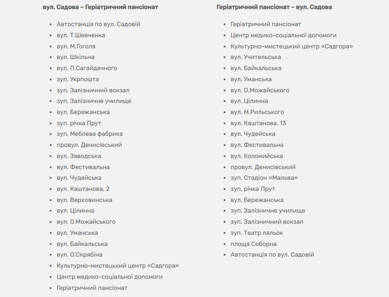 Перелік зупинок автобусів №13. Скріншот із сайту Чернівецького тролейбусного управління