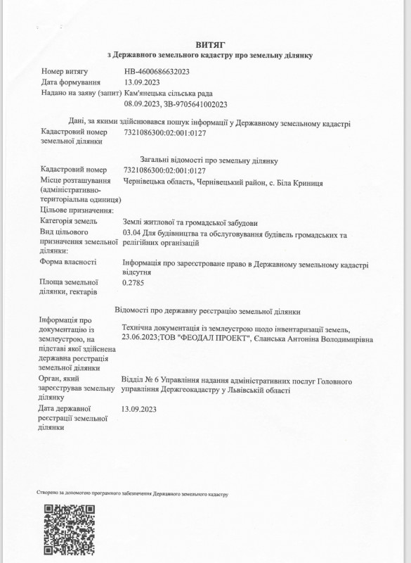 4. Не може бути, але так є, що ще до вересня 2023 року земельні ділянки під культовими спорудами Білої Криниці не були сформовані як об’єкт права у відповідності до вимог законів нашої держави. Лише 13 вересня 2023 року, завдяки старанням і відповідальності Кам’янецької сільської ради, яка підготовила всю необхідну документацію, вони були занесені в Державний земельний кадастр України.