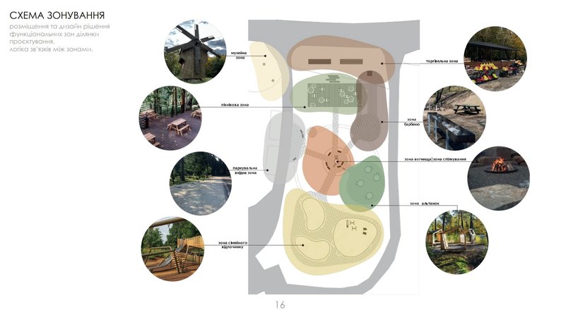 Простір для відпочинку поділили на зони, які об’єднуються навколо основи – вогнища. Там будуть торгова зона з ятками, тераса зі столиками, зона для барбекю та з Wi-Fi, зона з альтанками, паркінг, а також дитячі майданчики окремо для дітей старшого віку та молодшого й середнього. Дизайн зони розробили за фінансування програми DOBRE.