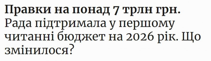 Народні депутати Верховної Ради (ВР) схвалили за основу проєкт Держбюджету України на 2026 рік з низкою поправок, які раніше затвердив бюджетний комітет. Кошторис передбачає рекордні видатки, історичний дефіцит, зростання курсу долара і перший за два роки перегляд прожиткового мінімуму, а також мінімальних зарплат та пенсій.