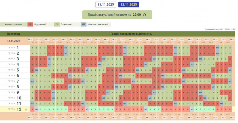ГРАФІК ПОГОДИННИХ ВІДКЛЮЧЕНЬ НА 12 ЛИСТОПАДА