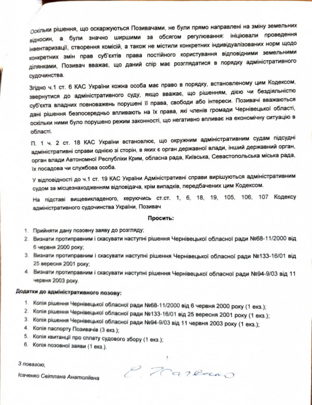 В жовтні 2015 року я, як громадянка України, зацікавлена у верховенстві права і непорушності законів нашої держави, подала адміністративний позов з вимогою скасувати рішення Чернівецької обласної ради щодо так званих лісів АПК 2000, 2001 та 2003 року як незаконні.