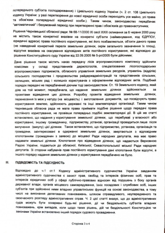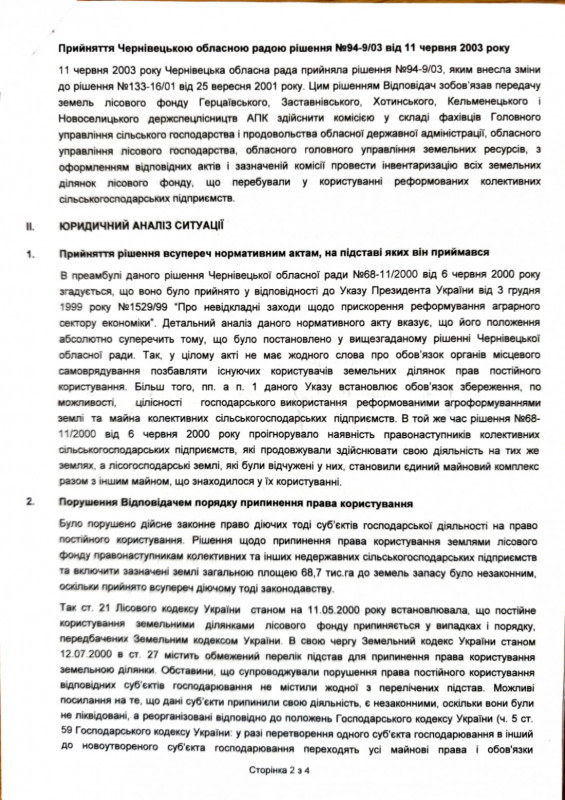 «Папери з архіву, названі в позові Рішенням Чернівецької облради №68-11/2000 від 6 червня 2000 року, не витримують правової критики, – зазначив в суді адвокат Фортуна. — По суті, це фальсифікація без підпису, з перекрученими датами, коли рішення ніби прийняте, але навіть раніше, аніж звернення від РДА та юридичні зауваження до нього, в яких юристи облради зазначили незаконність в запропонованому вигляді вилучати і передавати лісфонд, що законно належав правонаступникам колгоспів, до новостворених лісгоспів системи АПК».