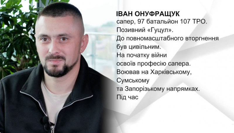 Іван Онуфращук, сапер, 97 батальйон 107 ТРО. Позивний «Гуцул». Після втрати кінцівки, він не втратив оптимізму. Нині займається протезуванням побратимів, а свій протез виготовив для себе сам.
