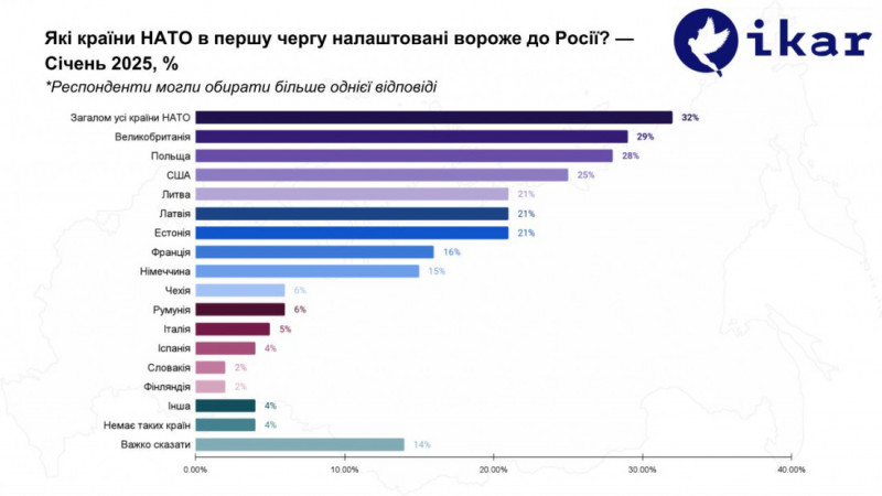 У відповідях на питання «Хто є найбільшим супротивником РФ на міжнародній арені?» США не на першому місці – респонденти вказують блок НАТО. На сьогодні немає країни Заходу, на яку була б спрямована понад третина голосів негативу, але більший відсоток негативу отримують Великобританія, потім Польща, а потім інші країни Європи.