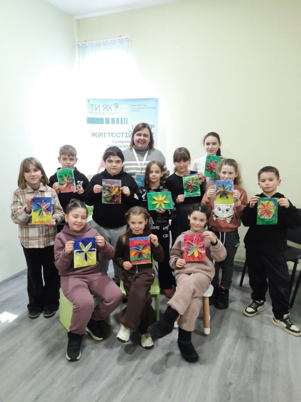 Для школярів організовано арт-терапевтичну активність, під час якої учасники працювали над створенням спільної композиції. Кожна дитина оформлювала окремий елемент — пелюстку, наповнюючи її кольорами, орнаментами та авторськими малюнками. Через творчий процес діти передавали власні емоції, мрії та бачення світу.