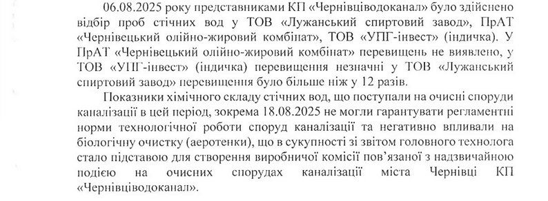 Вперше погіршення роботи блоку очищення у Чернівцях зафіксували у липні 2025 року. Тоді взяли проби, аби виміряти концентрацію забруднення стічних вод. Головний технолог водоканалу серед усіх виокремив Садгірський напрямок, куди зливають стічні води і люди, і компанії, зокрема Лужанський спиртзавод. Потім окремо взяли проби води кількох підприємств і саме у спиртзаводу показники були вищими за норму у 12 разів. Про це йдеться у зверненні водоканалу, зокрема до правоохоронців та екоінспекції, яке поширив міський голова Роман Клічук.