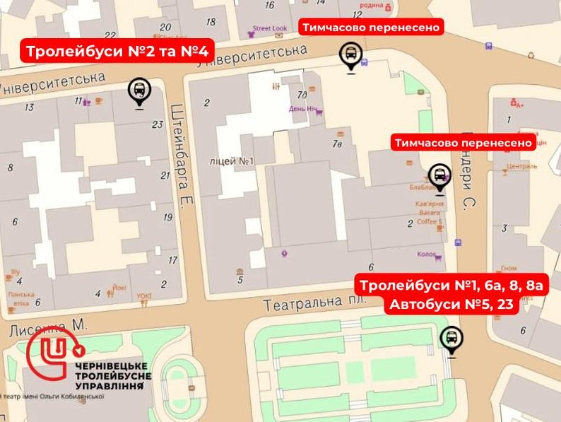 Схема тимчасової зміни зупинок громадського транспорту. Чернівецьке тролейбусне управління