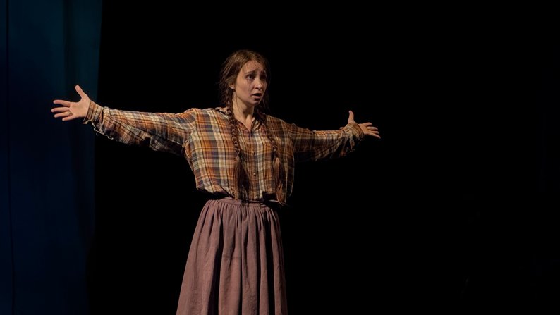 Фото з репетиції вистави “Жанна дʼАрк”. На фото акторка театру Маргарита Муранцева, яка грає головну роль. Суспільне Чернівці