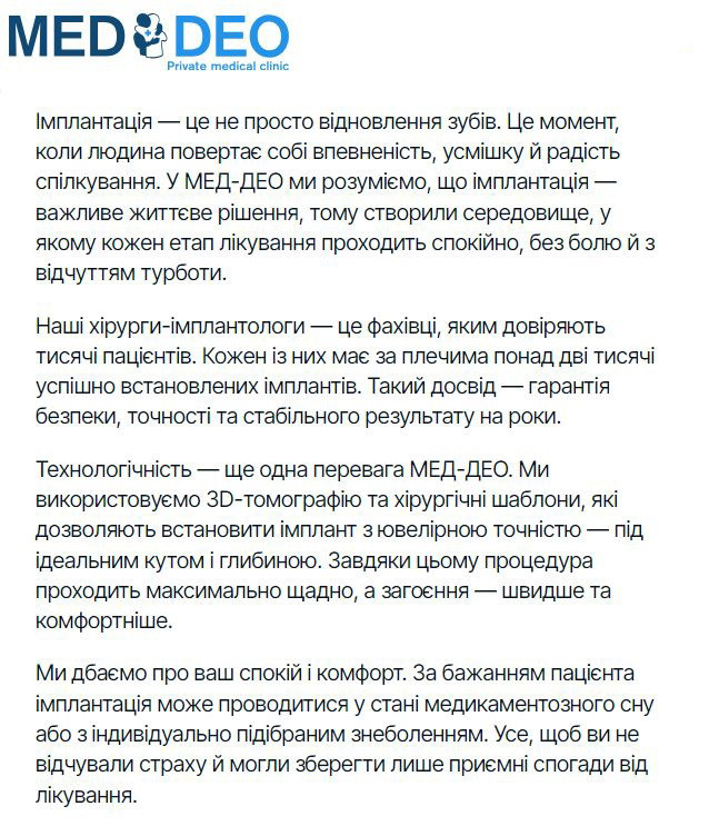 Якщо говорити прямо – імплантація сьогодні вже не є чимось «складним і страшним». Це звичайна практика, яка дозволяє повернути комфорт і якість життя.