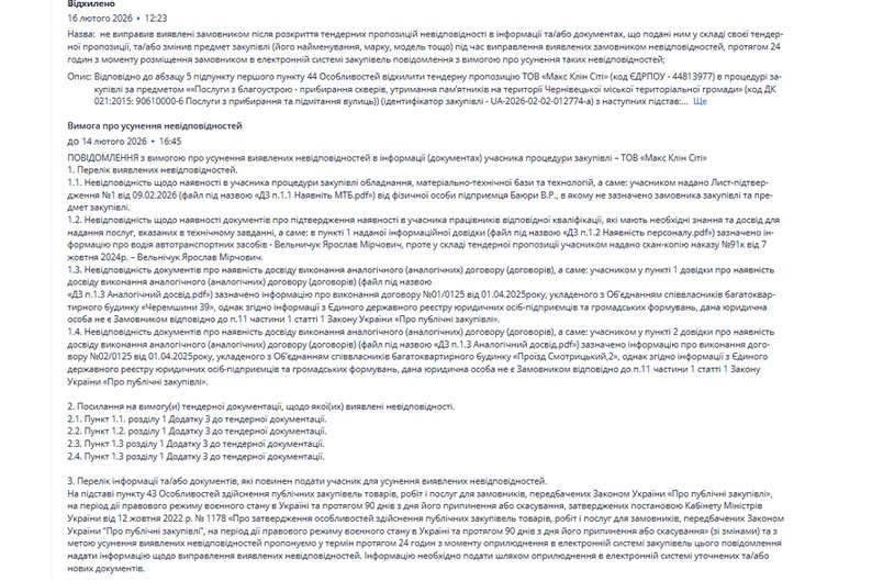 Скріншот обґрунтування відхилення пропозиції ТОВ “Макс Клін Сіті” за закупівлею щодо прибирання скверів у Чернівцях. Prozorro