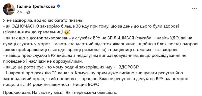 За словами Третьякової, незрозуміло, як одночасно захворіло понад 38 народних депутатів, враховуючи, що напередодні вони були здорові. Також вона звертає увагу на те, що показники захворюваності серед служб ВРУ, включно з УДО, не зросли, також здорові прибиральниці та працівниці столових.
