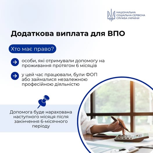 Особи з числа ВПО, які працюють, займаються підприємництвом або незалежною професійною діяльністю протягом 6 місяців отримання допомоги на проживання, мають право на ще одну виплату.