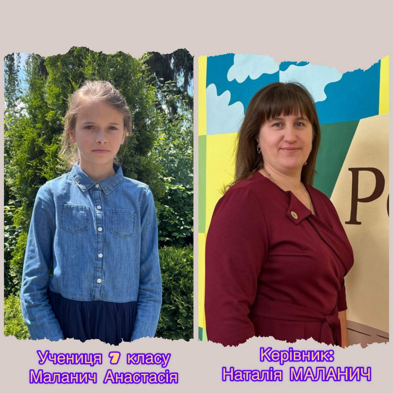- Анастасія Маланич, учениця 7 класу опорного закладу «Біоусівський ліцей», учитель української мови та літератури — Наталя Маланич;