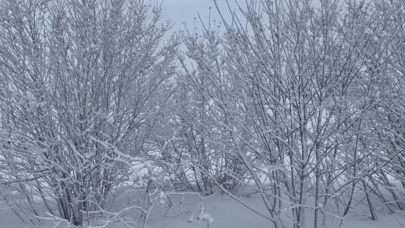 Засніжений кущ на узбіччі дороги в Чернівецькій області. Суспільне Чернівці/Марія Антоняк
