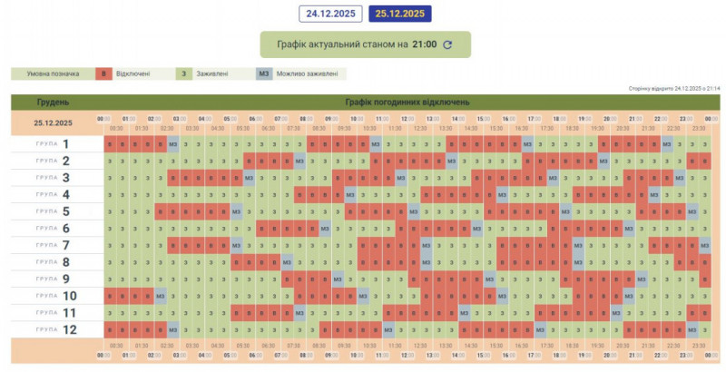 На Різдво, 25 грудня, у переважній більшості регіонів України будуть діяти графіки погодинних відключень електропостачання для населення. Час дії та тривалість обмежень визначатиметься залежно від конкретного регіону.
