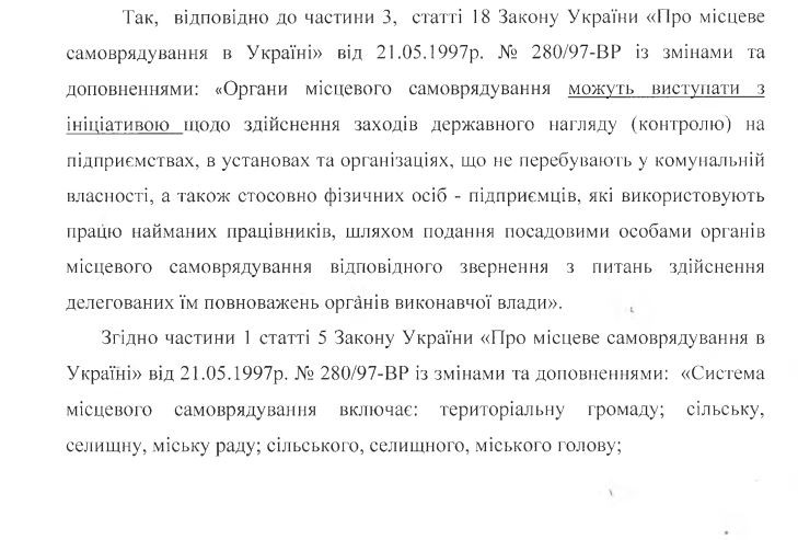 У відповіді сільрада послалася на частину третю статті 18 Закону України “Про місцеве самоврядування в Україні”, згідно з якою органи місцевого самоврядування можуть ініціювати здійснення заходів державного нагляду (контролю) на підприємствах, установах та організаціях, що не перебувають у комунальній власності, шляхом подання відповідних звернень до органів виконавчої влади.