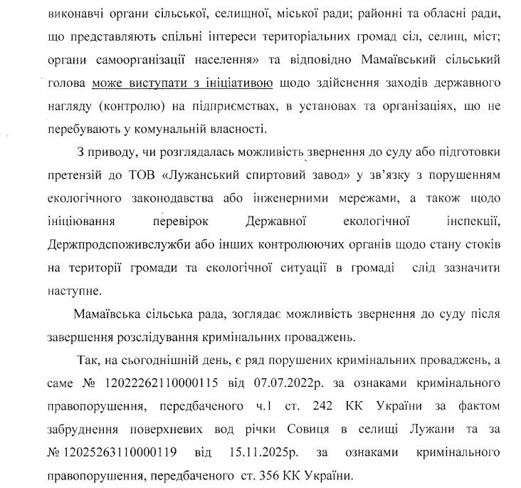 На запитання про те, чи розглядалася можливість звернення до суду або підготовки претензій до Лужанського спиртзаводу у зв’язку з порушенням екологічного законодавства або умов користування інженерними мережами, у Мамаївській сільській раді повідомили, що таку можливість розглядають після завершення кримінальних проваджень.