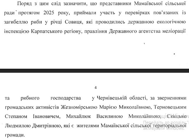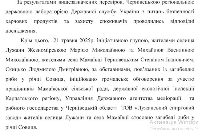 У листі йдеться про чинний договір оренди інженерних мереж, відсутність технічних вимог до очисних установок, а також про участь представників громади у перевірках, ініційованих громадськими активістами. Водночас у відповіді не зазначено, чи сама громада ініціювала такі перевірки та скільки скарг на забруднення довкілля надійшло від мешканців за останній рік.