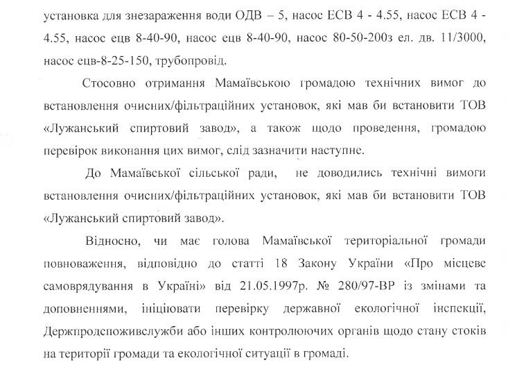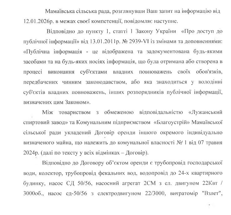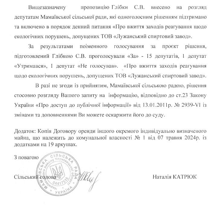 Мамаївська сільська рада надала відповідь на інформаційний запит БукІнфо щодо договірних відносин громади з Лужанським спиртовим заводом, можливих екологічних порушень, а також реагування органу місцевого самоврядування, зокрема можливості звернення до суду.