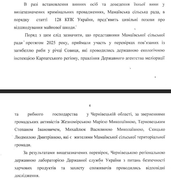 У відповіді зазначено, що станом на сьогодні відкрито кілька кримінальних проваджень, зокрема за фактом забруднення поверхневих вод річки Совиця у селищі Лужани (стаття 242 Кримінального кодексу України), а також за ознаками самоправства (стаття 356 КК України). У сільській раді повідомили, що у разі встановлення винних осіб та доведення їхньої вини громада планує подати цивільні позови про відшкодування майнової шкоди відповідно до статті 128 Кримінального процесуального кодексу України.