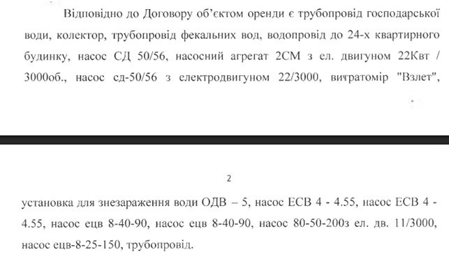 Йдеться про договір № 1 від 7 травня 2024 року. Згідно з наданою інформацією, предметом оренди є, зокрема, трубопровід господарської води, каналізаційний колектор, трубопровід фекальних вод, водопровід до 24-квартирного будинку, а також насосне обладнання, витратоміри та установка для знезараження води. Копію договору з додатками сільська рада надала у відповідь на запит.