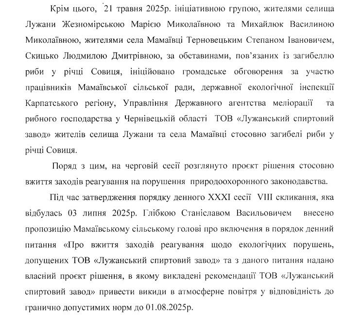 Окрім цього, у відповіді на запит Мамаївська сільська рада повідомила про розгляд питання екологічних порушень, пов’язаних із діяльністю спиртзаводу, на сесії ради. Зокрема, 3 липня 2025 року під час XXXI сесії VIII скликання депутат Станіслав Глібка ініціював включення до порядку денного питання “Про вжиття заходів реагування щодо екологічних порушень, допущених ТОВ “Лужанський спиртовий завод””.