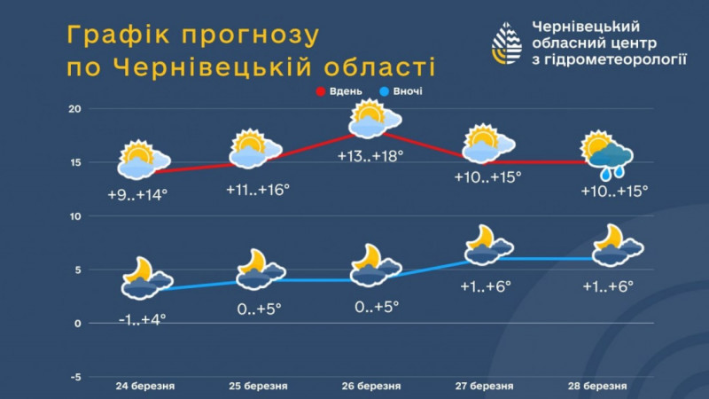 24-26 березня погоду Буковини формуватиме північний антициклон. Очікується мінлива хмарність, без опадів. З 27 березня на погоду впливатиме циклон з Балкан. Вдень 28 березня пройде невеликий дощ.