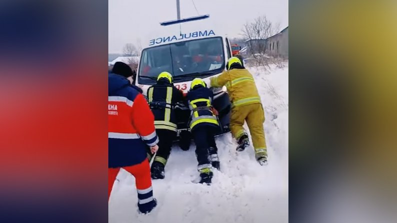 У Сторожинці Чернівецької області карета екстреної допомоги застрягла в снігу, коли їхала на виклик до пацієнта. Довелося викликати рятувальників, щоб відбуксирувати авто. Це був другий такий випадок за добу 24 січня.