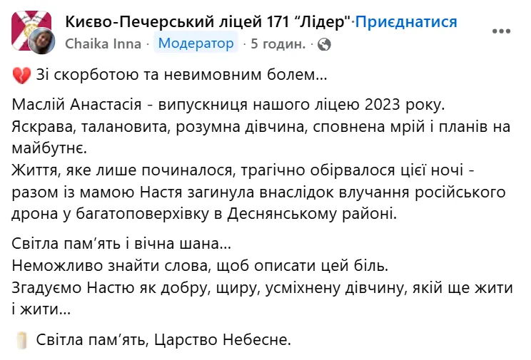“Зі скорботою та невимовним болем… Маслій Анастасія – випускниця нашого ліцею 2023 року. Яскрава, талановита, розумна дівчина, сповнена мрій і планів на майбутнє. Життя, яке лише починалося, трагічно обірвалося цієї ночі – разом із мамою Настя загинула внаслідок влучання російського дрона у багатоповерхівку в Деснянському районі. Світла пам’ять і вічна шана… Неможливо знайти слова, щоб описати цей біль. Згадуємо Настю як добру, щиру, усміхнену дівчину, якій ще жити і жити… Світла пам’ять, Царство Небесне”, – написала класна керівниця Інна Чайка.