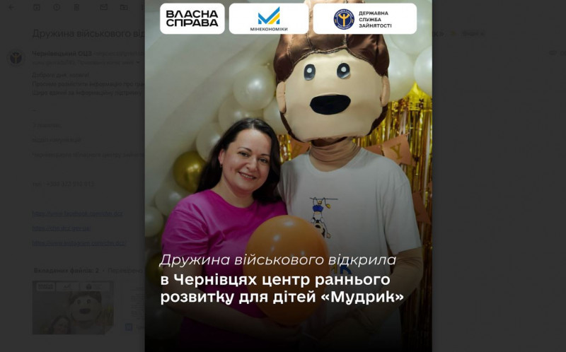 Ірина Капанадзе дружина військового, тривалий час переживала складні часи через війну та неспокій за чоловіка, та опанувала свої хвилювання і відкрила у Чернівцях – центр раннього розвитку дитини за допомогою «Гранту для ветеранів та членів їх сімей». Ірина цілеспрямовано йшла до своєї мети – проходила курси, неодноразово брала участь у нетворкінгах на базі офісу «Зроблено в Україні», які сприяють розвитку її бізнесу як новачка у цій справі.