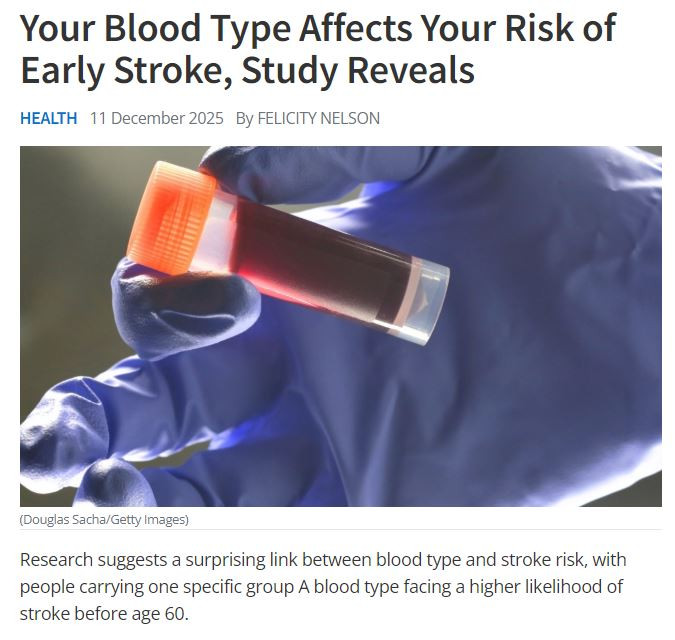 Новий аналіз генетичних даних показав: люди з варіацією групи крові А мають дещо вищу ймовірність пережити інсульт до 60 років. Дослідження, опубліковане 2022-го, стало одним з наймасштабніших у цій сфері і поглибило розуміння того, як біологічні особливості можуть впливати на стан судин.