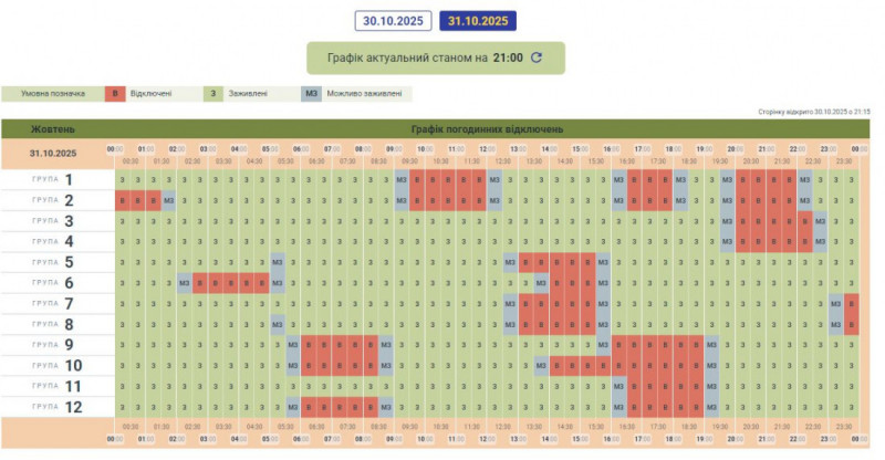 По всій території України у пʼятницю, 31 жовтня, всю добу будуть задіяні погодинні відключення електроенергії, повідомляє Міненерго.