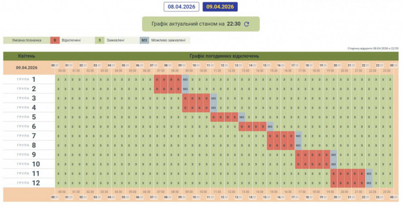 Як повідомили енергетики, графік погодинних відключень вводять за розпорядженням державної компанії НЕК «Укренерго» відповідно до оперативної ситуації в енергетичній системі України. Спрогнозувати впровадження таких графіків заздалегідь неможливо.