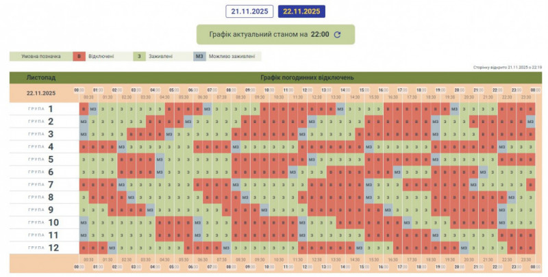 У суботу, 22 листопада, графіки відключень світла будуть трішки м’якшими, ніж сьогодні: до 10-11 годин на добу у більшості регіонів України.