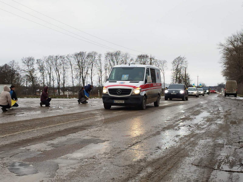 Жителі громади зустрічали траурний кортеж вздовж автошляхів, з прапорами, стоячи на колінах.