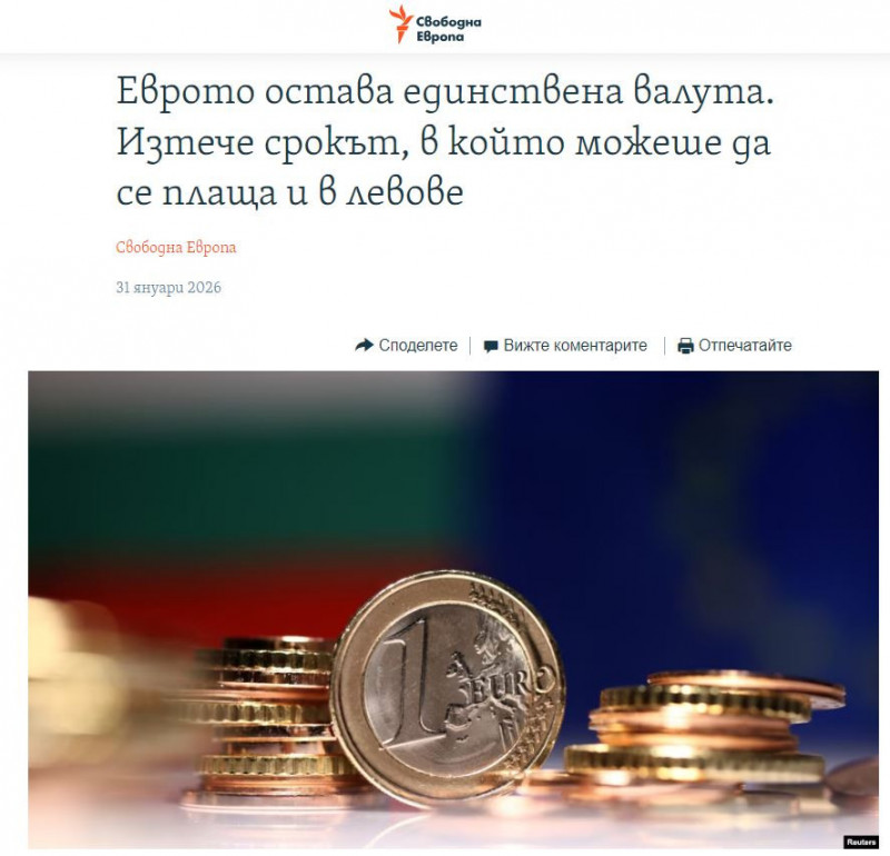 Опівночі 31 січня в Болгарії завершився одномісячний період паралельного обігу національної валюти лева та євро. Від 1 лютого торговельні заклади більше не зобов’язані приймати оплату в левах і мають видавати решту виключно в євро.