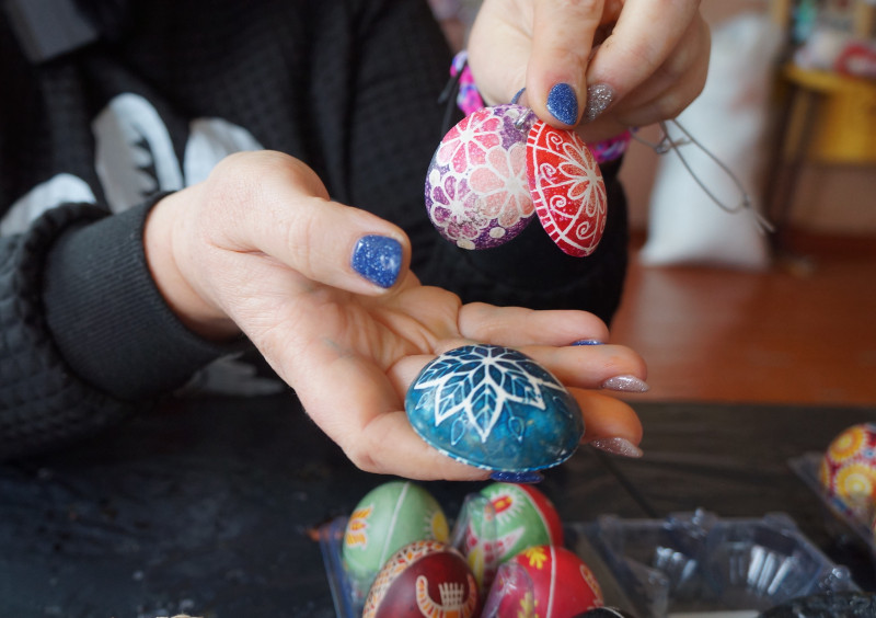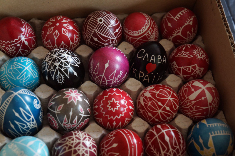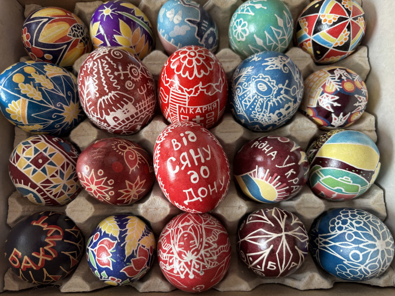 "Це був 2023 рік, ми писали всім містом цілий тиждень. Було написано близько 300 писанок. Це були "живі" писанки, які писалися на сирих яйцях. Ми передавали їх на фронт нашим захисникам. Там було дуже багато писанок з обереговими символами саме для військових, для воїнів, які б їх оберігали", — розповідає майстриня.