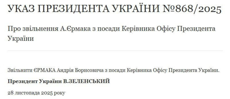 “Звільнити Єрмака Андрія Борисовича з посади Керівника Офісу Президента України. Президент України В.Зеленський. 28 листопада 2025 року”.