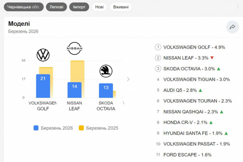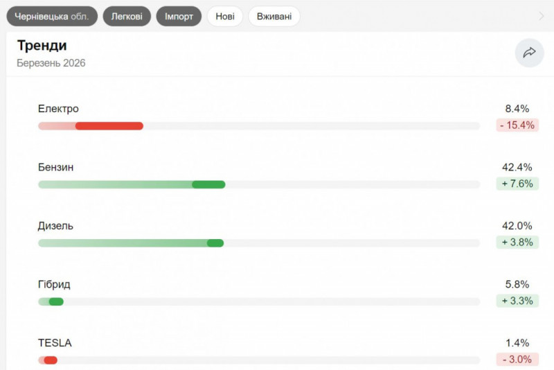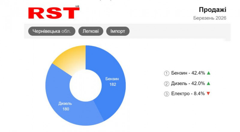 У березні на ринку імпортованих легкових авто у Чернівцях та області бензинові та дизельні моделі зміцнили позиції та майже зрівнялися за частками.