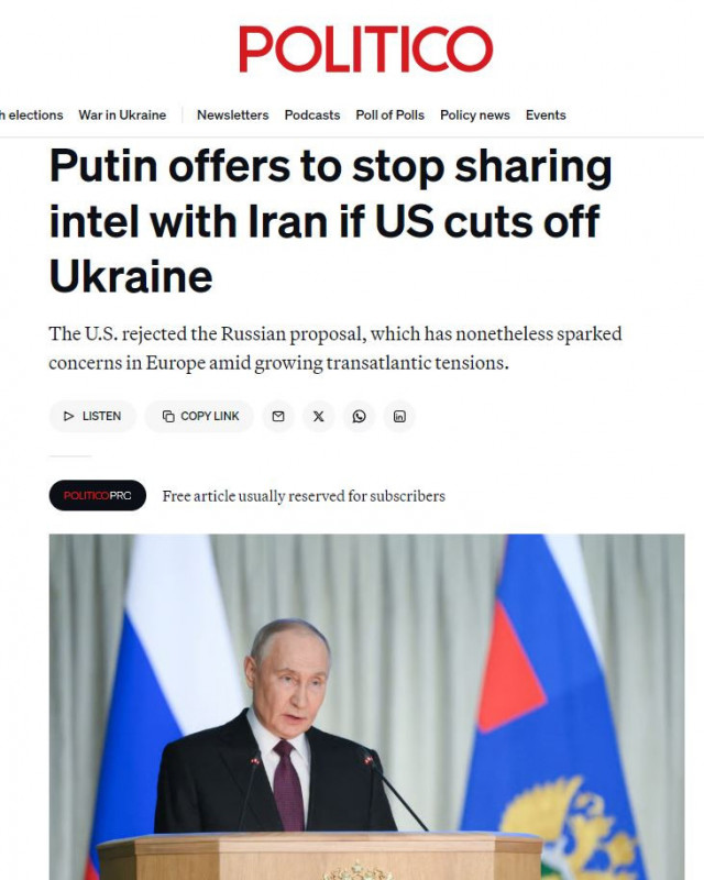 Росія запропонувала Сполученим Штатам угоду, яка передбачала припинення обміну розвідданими Москви з Іраном в обмін на відмову Вашингтона від передачі інформації Україні. Америка відхилила цю ініціативу. Однак сама її поява викликала занепокоєння серед європейських країн.