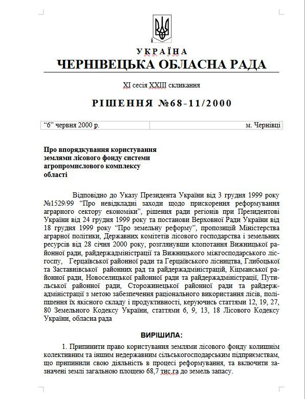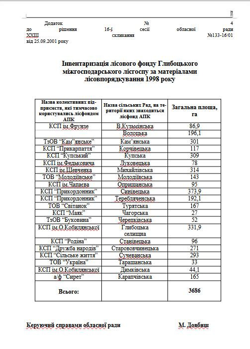 Наприклад, Глибоцький держспецлісгосп АПК у 2000 році отримав від облради гамузом 4,1 тис га. Через рік депутати передумали і зменшили свій «подарунок» до 3,686 тисяч га. Питання не тільки в тому, в чиїх руках опинилася різниця. Головне — ці землі перебували в законному користуванні діючих агроформувань (див. прикріплений файл). Схоже на чисте рейдерство, коли у агротовариства «Кам’янське» в адміністративних межах Кам’янецької сільради облрада забрала 301 гектар, а від КСП «Дружба народів» Старововчинецької сільради — 271 гектар.