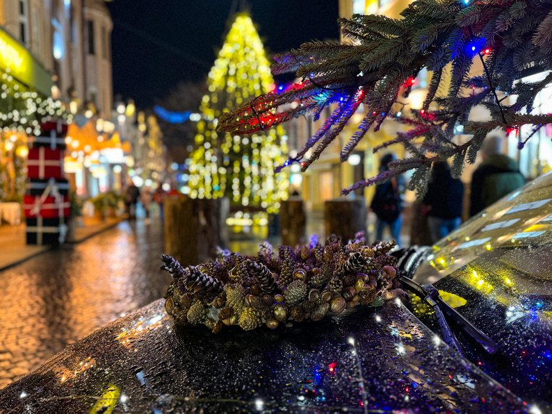 Серед святкових інсталяцій на вулиці Ольги Кобилянської – авто з гірляндами та ялинкою на даху. Це – одна з фотозон.