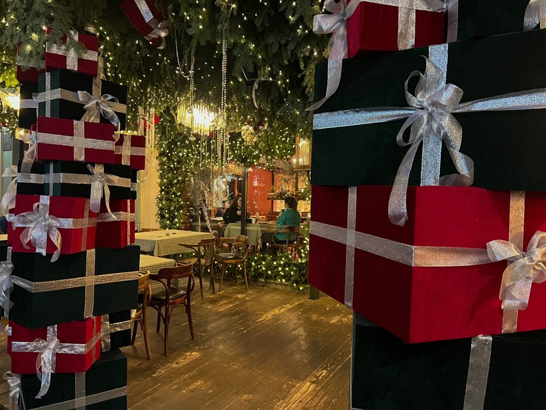 Тераса закладу, прикрашена коробками у стилі новорічних подарунків. Суспільне Чернівці