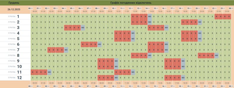 Графік погодинних відключень електрики на 26 грудня 2025 року. АТ “Чернівціобленерго”