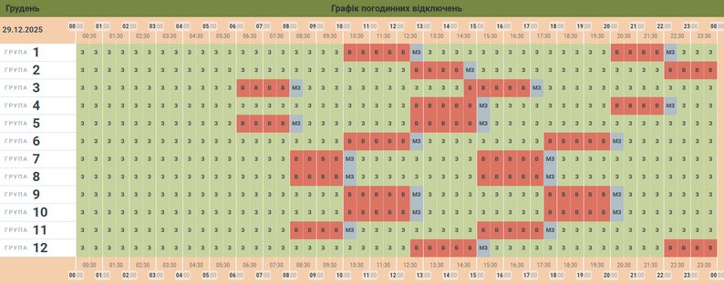 Графік погодинних відключень електрики на 29 грудня 2025 року у Чернівцях. АТ “Чернівціобленерго”