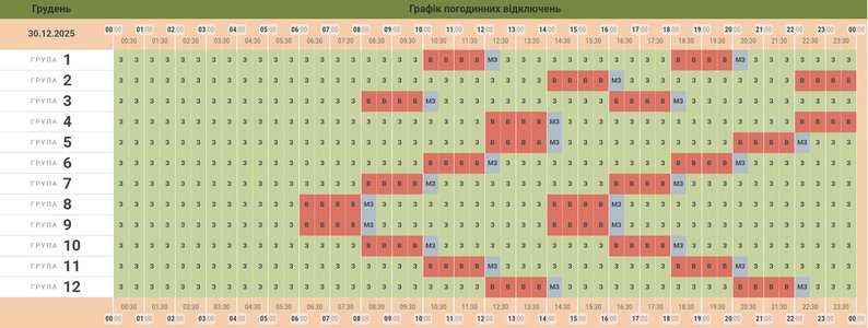 Графік погодинних відключень електрики на 30 грудня 2025 року у Чернівцях. АТ “Чернівціобленерго”