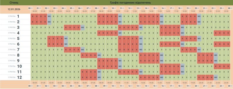 Графік погодинних відключень електрики на 12 січня. АТ “Чернівціобленерго”