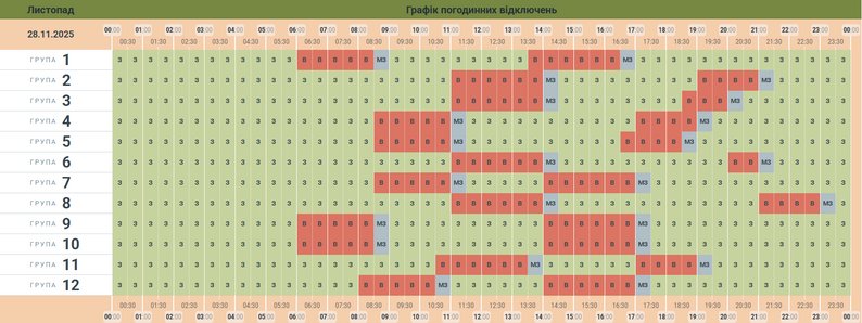 Графік погодинних відключень електрики на 28 листопада 2025 року. АТ “Чернівціобленерго”